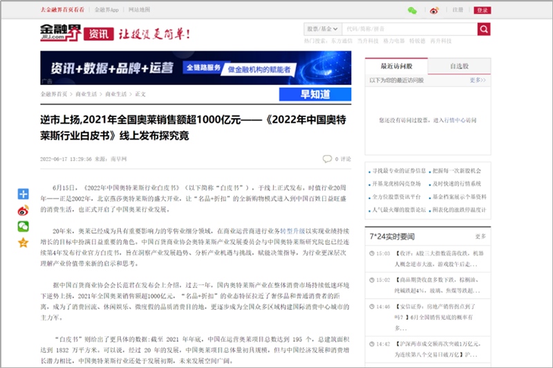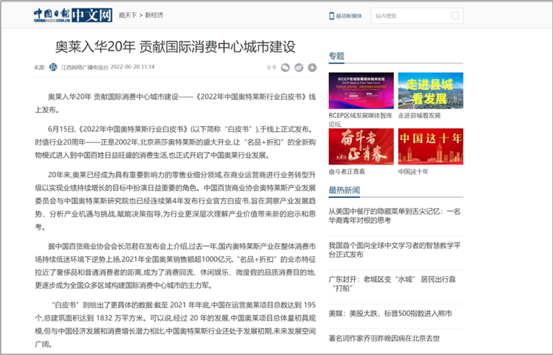 2022年6月15日,中國(guó)百貨商業(yè)協(xié)會(huì)奧特萊斯產(chǎn)業(yè)發(fā)展委員會(huì)線上直播發(fā)布《2022年中國(guó)奧特萊斯行業(yè)白皮書(shū)》。白皮書(shū)中“2021年中國(guó)零售市場(chǎng)最新發(fā)展、中國(guó)奧萊20年全覽、2021年中國(guó)奧萊市場(chǎng)發(fā)展、中國(guó)奧萊展望和政策建議、專(zhuān)家訪談”等內(nèi)容吸引政府領(lǐng)導(dǎo)、專(zhuān)業(yè)機(jī)構(gòu)、產(chǎn)業(yè)運(yùn)營(yíng)商、品牌商、服務(wù)商、媒體記者及眾多奧萊消費(fèi)者共計(jì)20余萬(wàn)人參會(huì),成為國(guó)內(nèi)奧萊行業(yè)年度一大焦點(diǎn)。