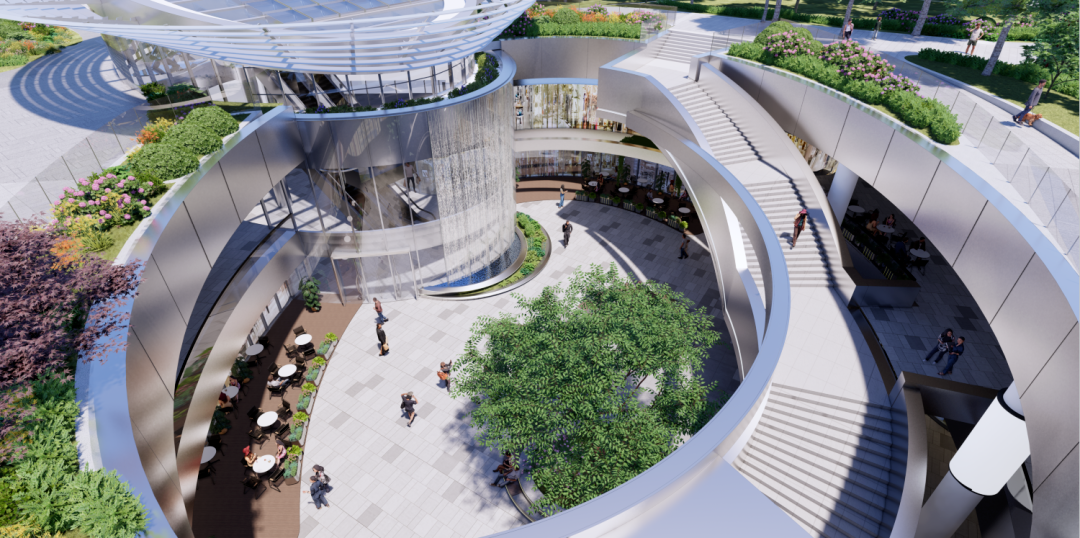 項目設(shè)計了若干下沉廣場,將地下空間向城市和公園界面開放,打造具有生態(tài)層次感的庭院-花園-公園,從而實現(xiàn)地下-地面-屋頂?shù)娜讓涌臻g規(guī)劃。不僅給到了項目和品牌乃至這個城市更多的場景敘事和想象空間,同時也給消費者帶來了更多更豐富的社交空間、沉浸體驗空間,最終打造了一個完美的生態(tài)場域。