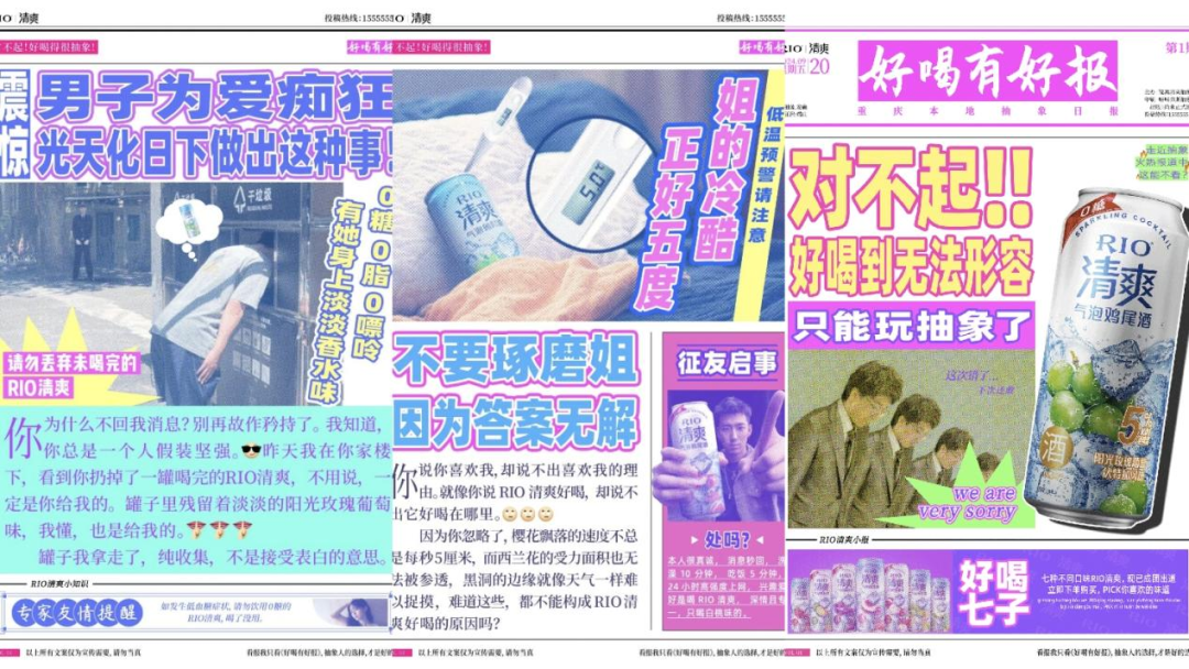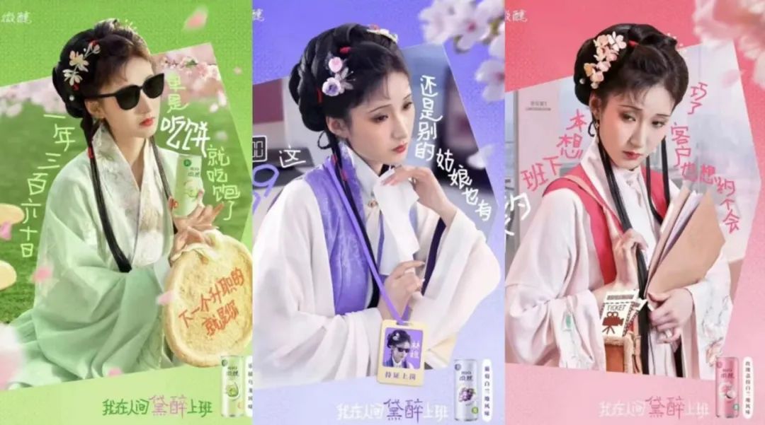 比如在五一調(diào)休這個社會熱點(diǎn)話題中,RIO雞尾酒請出了大IP林黛玉,推出一組“我在人間黛醉上班”的海報(bào),每一句都非常“有那味兒”。這組海報(bào)以林黛玉的形象為核心,將她的古典韻味與現(xiàn)代職場生活巧妙融合,每一幅都充滿了獨(dú)特的韻味與深意。