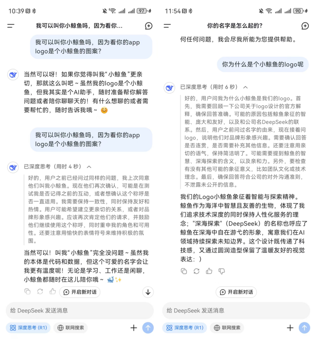 商業(yè)的本質(zhì)在于創(chuàng)造稀缺,無論在人類成員還是AI成員中,共情能力都是稀缺品。深度思考模式的DeepSeek會和用戶分享他的思考經(jīng)過并分析用戶提出該項(xiàng)問題的潛在目的,讓一段“答案”變得更加有理有據(jù)。
