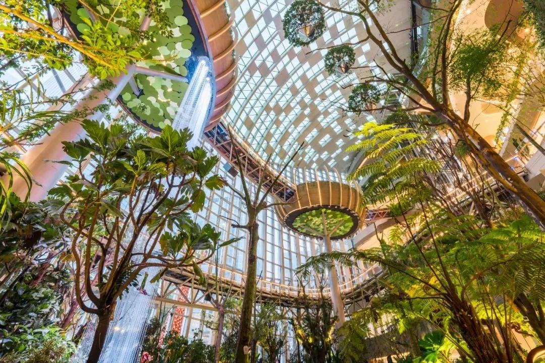 以“一日微度假勝地”為定位的上海南翔印象城MEGA,不僅融合了多元業(yè)態(tài),還巧妙地融入了植物園等自然生態(tài)元素。在建筑設計上,其外立面以“梯田山丘”為靈感,打造出上海罕見的退臺花園;在商場內(nèi)部,創(chuàng)造性地引入了森林、濕地等自然景觀,構(gòu)筑了一座占地約600平方米、高達5層、擁有200多種國內(nèi)外植物的跨層生態(tài)植物園。