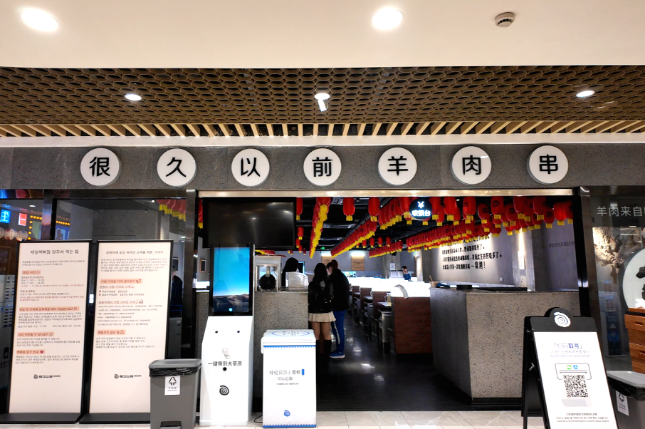 值得一提的是,在國家開放免簽政策,韓國旅客接踵而至,其統(tǒng)一的打卡模式直接帶火了“很久以前羊肉串”,尚未到正式的用餐時間,該門店前已開始排隊,其中大部分等位人員為韓國游客。他們除了可以在店員的輔助下使用烤爐現烤現吃,還將門店附贈的“冰涼貼”作為了打卡的必備項目。