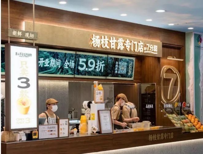 去年,七分甜的首家楊枝甘露專門店在上海長寧龍之夢開業(yè),在產品方面,專門店僅售三款產品,分別是1987經典楊枝甘露、2007鮮芒楊枝甘露、楊枝甘露Gelato,分為碗裝、杯裝和冰淇淋,定價在15-20元。在店型方面,走小店模式,不設堂食。專門店面積大約只有20平方米左右,目前僅支持下單后排隊自取。在裝修風格上,店內裝修以原木配色為主,主打簡約風。在鮮果陳列區(qū)擺放了制作楊枝甘露所需要的椰子、芒果、西柚等原料,采用明檔吧臺在顧客面前現切現做,讓消費者直觀感受產品的制作流程。