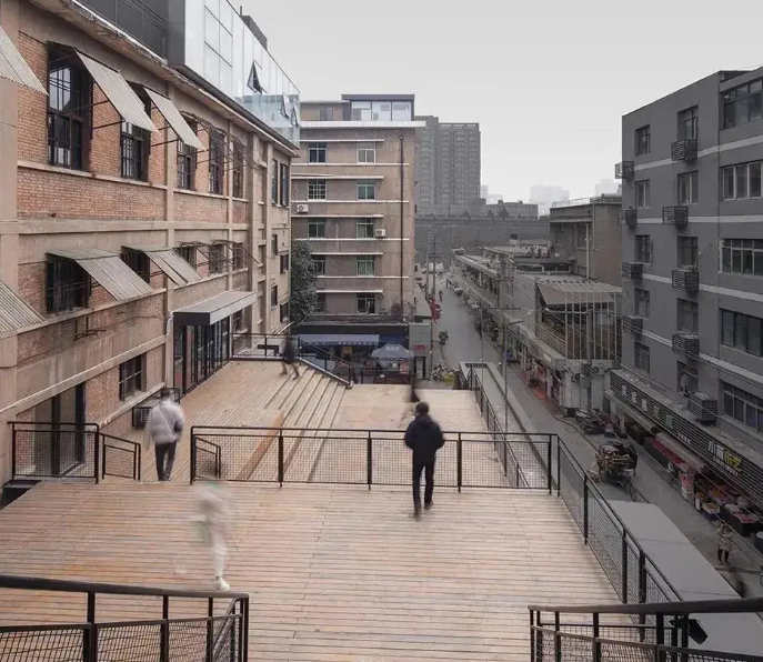 作為發(fā)起點,現(xiàn)有菜場部分被完全保留。項目最核心的“修補”有三處:連接市場入口與1、2號樓的臺階廣場,連接地面層與2號樓屋頂?shù)慕煌ㄍ?,以及連接2號樓屋頂和3號樓的連橋。開敞的臺階廣場層層上行,不僅引導人流進入上層空間,還成為了菜場公共生活的舞臺。同時,廢舊廠房改造成了如今免費開放的藝術展區(qū),這里不定期會舉辦各式不同主題的展覽活動,已經(jīng)成為新晉網(wǎng)紅打卡盛地。